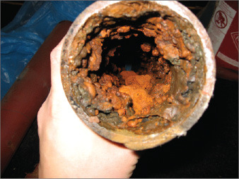 Oxidation seal from the lead inside the pipe. However all homes with lead service pipes should have the home tested for the presence of lead in the water. We cannot tell if a tree root or something else has disturbed this oxidation inside the lead service pipe to the home. Lead in water is a serious health hazard. ... Document Retrieval